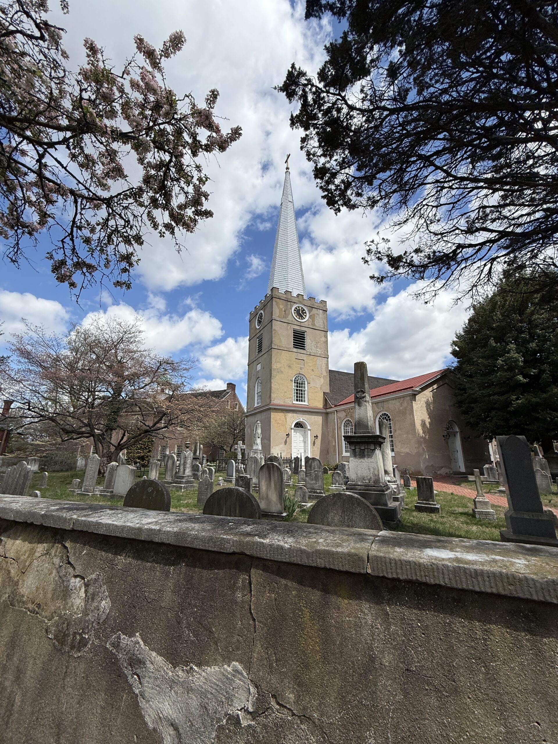 Behind the church lies its historic cemetery, a quiet resting place shaded by old oaks and filled with centuries-old headstones—many belonging to Revolutionary War soldiers, prominent colonial families, and early residents of New Castle.